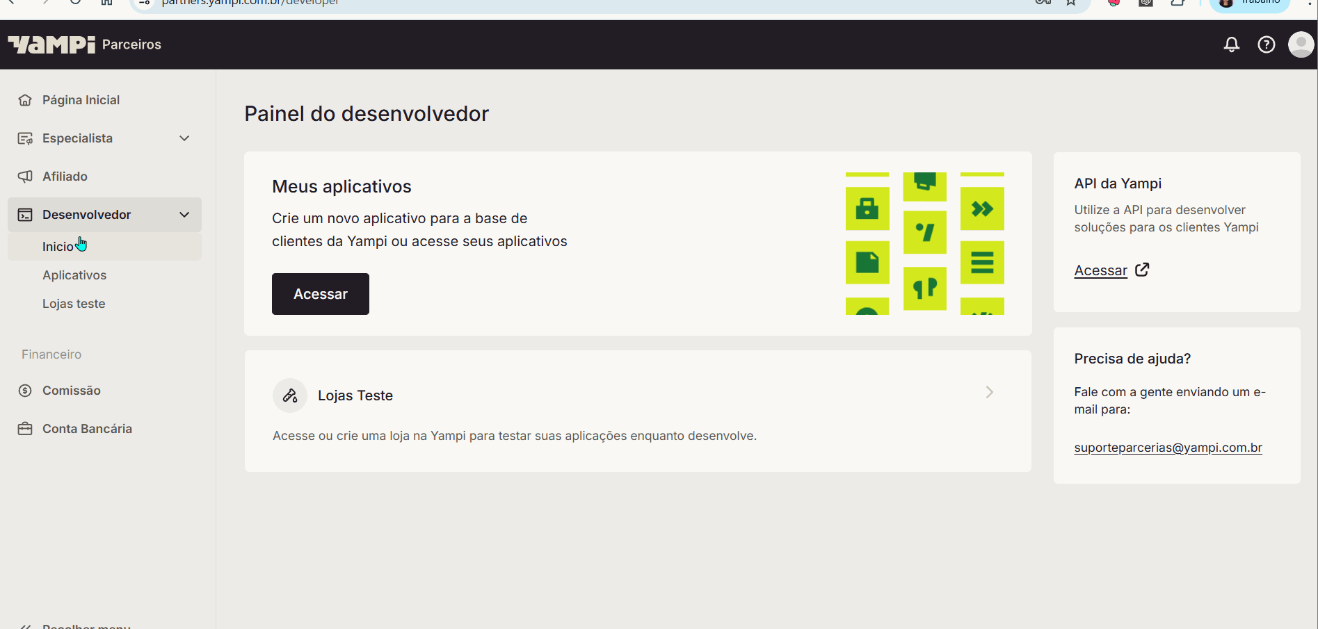 Entre no Painel do Parceiro Desenvolvedor da Yampi.