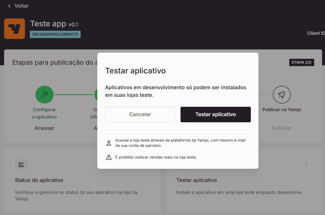 - Apenas aplicativos com o status “Em desenvolvimento” podem ser instalados em um ambiente teste.